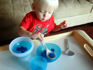 He enjoyed picking them up and dropping them back into the pan! I tried having him identify a blue ball, but he didn't quite seem ready yet. So I just gave him all blue ones next.