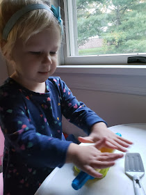 One of Sweet E's favorite shows is Mother Goose Club. We opened her Mother Goose Club book and found the dinosaur song so we could sing it while we stomped through the playdough!
