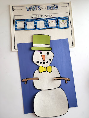 This free printable from Sara J Creations shows the different steps of how to build a snowman. So first Sweet E glued the pictures in order.