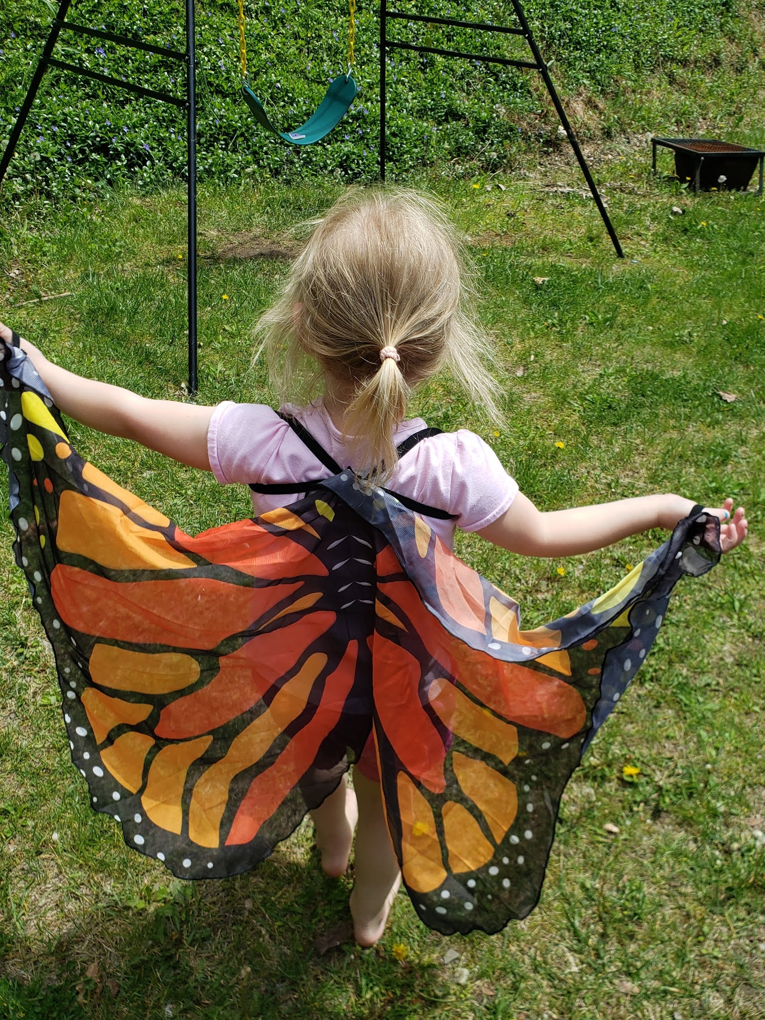 To end our fun week, I pulled out her shape puzzle and some costume wings from her dress-up bin. I placed the pieces throughout the backyard, then sent my little butterfly in search of shapes!