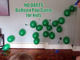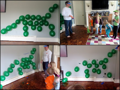As a final party game, my husband created a dinosaur out of balloons. Since we had young kids, and we were indoors, we didn't want to use darts. So my husband taped a thumbtack behind each balloon. One at a time, each child threw bean bags at the balloons, and if they hit one, it'd POP! Such a fun and exciting game. Inside some of the balloons were numbers, and whoever had the highest total from all the balloons they popped would win the last chocolate bar medal. This was a favorite game for all, I think, and a huge success. The inspiration for this game came from this blog.