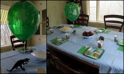 Here is the table where all of the kids sat to eat their snacks. Good dinosaur plates and cups are from Oriental Trading. We had some Skinny Pop and grapes set up on the table. All other food was on a table nearby.