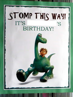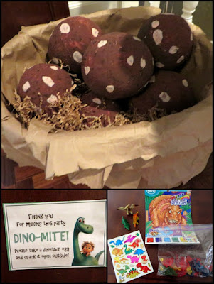 As a last minute addition to the party, I created this "river" out of a blue Dollar Tree tablecloth and some stones we had out in our yard. The idea was for the kids to carefully cross the stones without falling into the river, and they could "make their mark" on the other end. I had taped a Good Dinosaur picture there (yanked out of the banner I had purchased), and traced my son's hand on it. The kids had so much fun with this simple activity! It was played with throughout the party and through the weekend even, with our overnight guests.